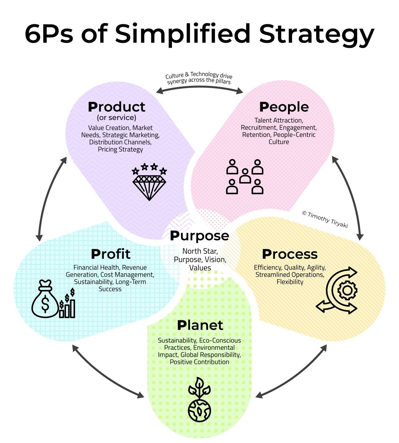 Biểu đồ bạn cung cấp minh họa một khung chiến lược gọi là “6Ps của Chiến lược Đơn giản hóa”, được tạo bởi Timothy Timur Tiryaki, PhD. Mô hình này được thiết kế để cung cấp cách tiếp cận rõ ràng, khả thi đối với chiến lược kinh doanh hiện đại, nhấn mạnh cả hiệu suất và trách nhiệm. Nó đặt Mục đích (Purpose) làm “Ngôi sao Bắc Đẩu” trung tâm hướng dẫn các trụ cột khác, đồng thời nhấn mạnh cách văn hóa và công nghệ tạo ra sự đồng bộ giữa tất cả các yếu tố.